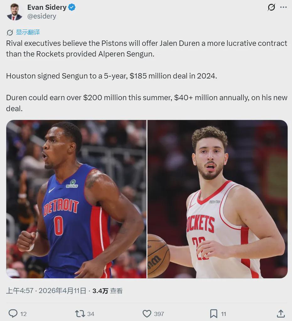 据福布斯体育记者Evan Sidery报道,活塞内线杰伦-杜伦在今夏有望获得5年超过2亿美元的新合同,均薪达到4000万美元以上。Evan Sidery表示,联盟普遍认为,活塞给杜伦的合同会高于2024年火箭给申京的合同(5年1.85亿)。