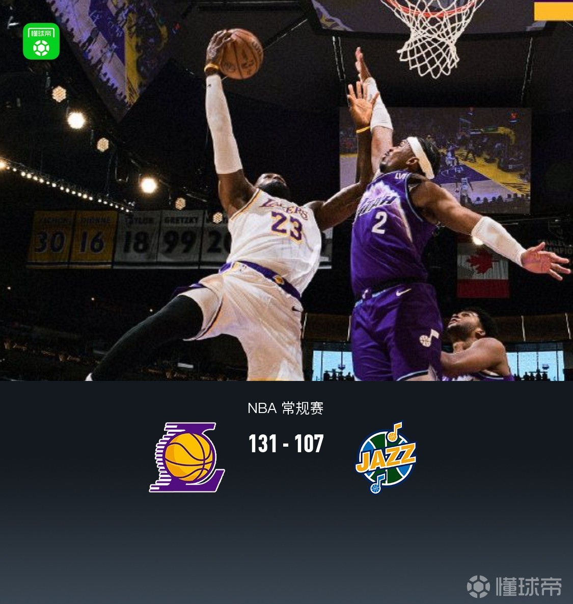 第四节,双方彻底进入练兵阶段,开节湖人克内克特。范德比尔特将分差一度拉大接近30分,全场结束,湖人131-107大胜爵士。
