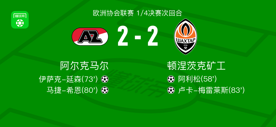 北京时间4月17日欧洲协会联赛 1/4决赛次回合,阿尔克马尔对阵顿涅茨克矿工。阿尔克马尔伊萨克-延森破门,马捷-希恩破门。顿涅茨克矿工阿利松破门,卢卡-梅雷莱斯破门。最终比分阿尔克马尔 2-2 顿涅茨克矿工。两回合总比分阿尔克马尔2-5顿涅茨克矿工。