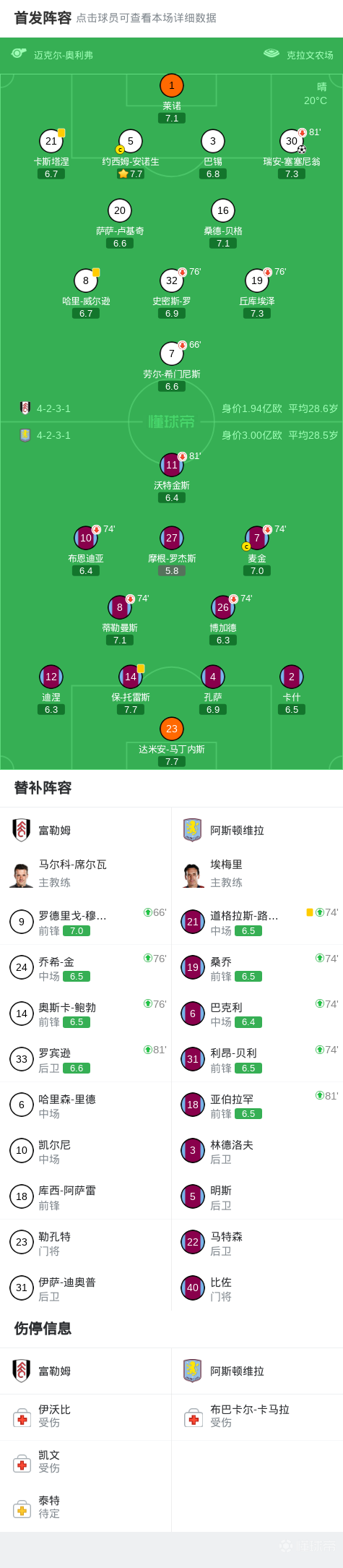 北京时间4月25日英格兰足球顶级联赛 联赛 第34轮,富勒姆主场对阵阿斯顿维拉。富勒姆瑞安-塞塞尼翁破门。最终比分富勒姆 1-0 阿斯顿维拉。
