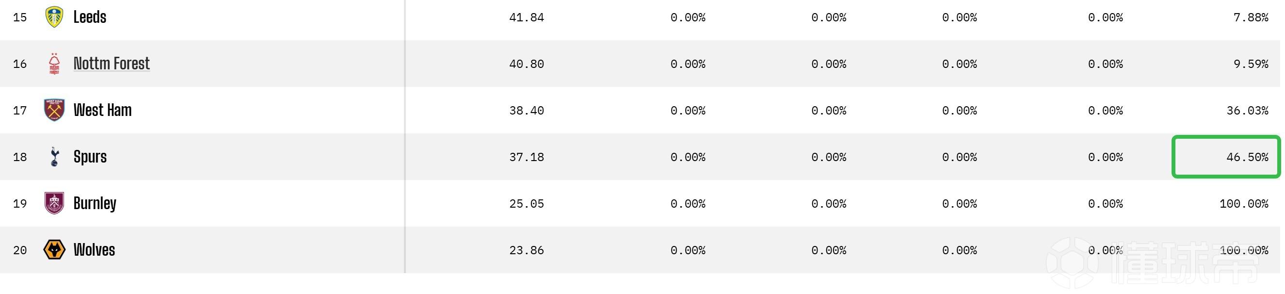 更为严峻的是,积分榜末端的两支球队——伯恩利与狼队——降级概率均已达到100%,基本被模型认定为“提前锁定降级名额”。在这样的背景下,剩余一个降级席位很可能将在热刺与西汉姆联之间产生,而热刺目前无疑处于更为被动的位置。