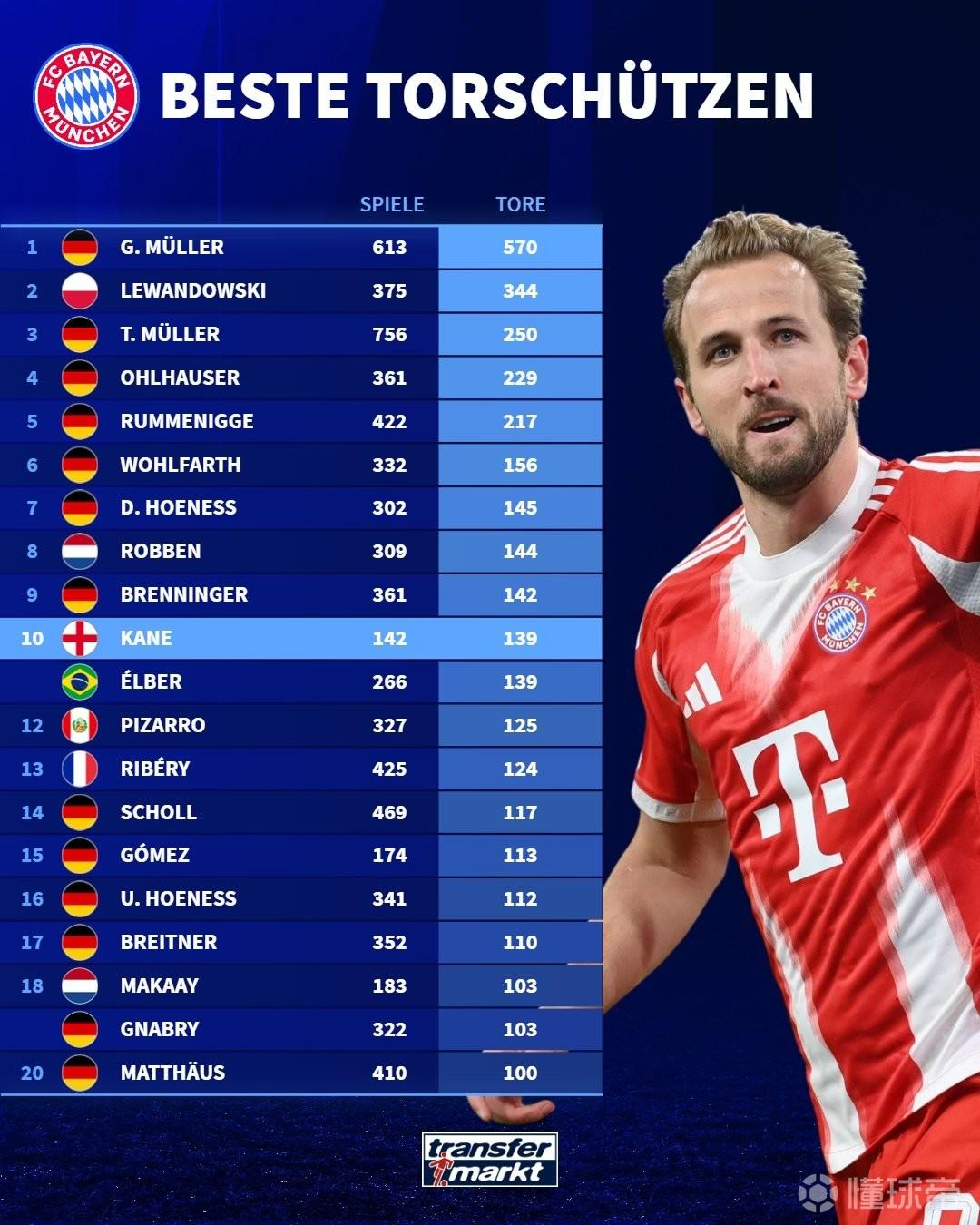 根据统计,自加盟拜仁以来,凯恩已经代表球队打进了139个进球,追平埃尔伯,位居拜仁队史射手榜第10名。