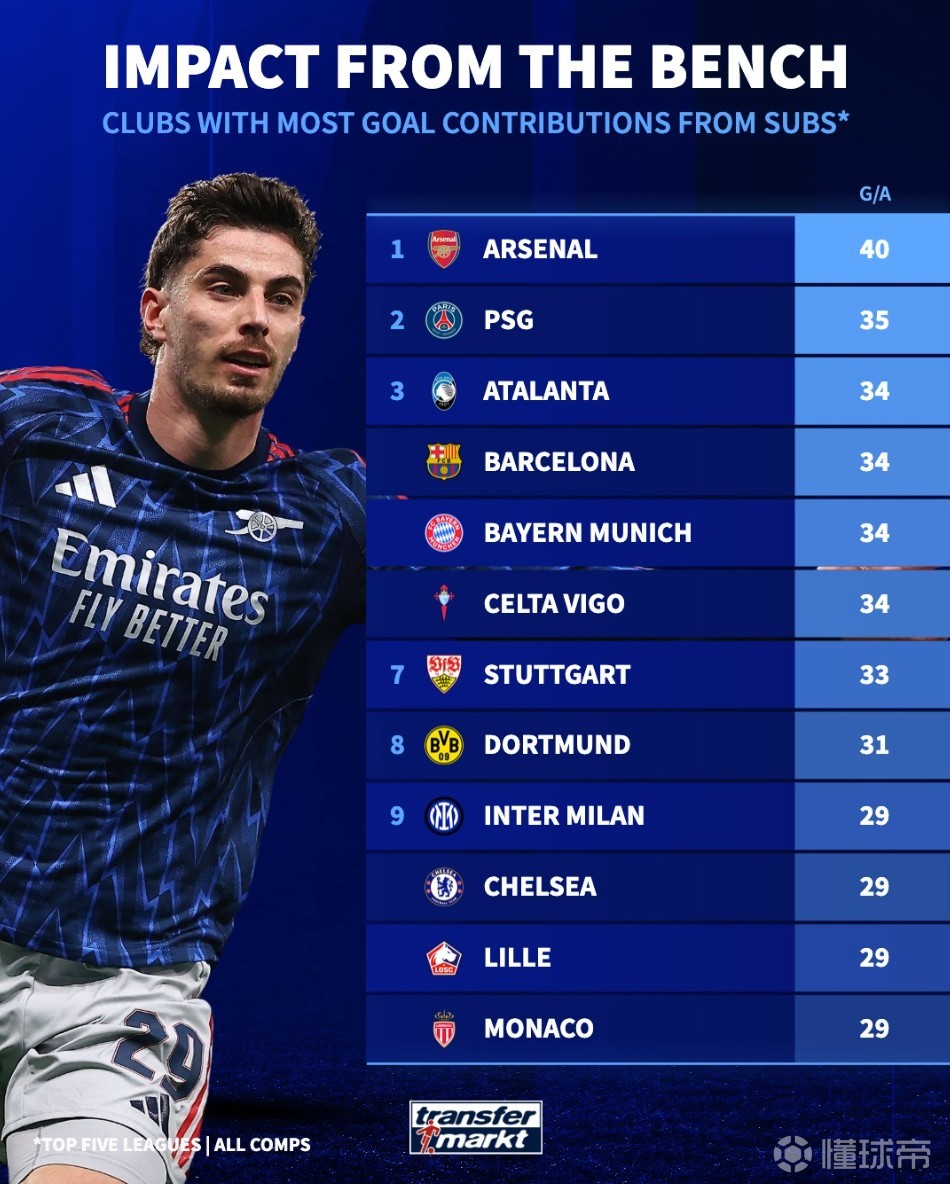 北京时间4月8日,德转统计出了本赛季至今欧洲五大联赛球队替补球员在各项赛事中直接参与进球数的排行榜,阿森纳以40球排名第一,巴黎圣日耳曼35球第二,巴塞罗那和拜仁慕尼黑34球并列第三。
