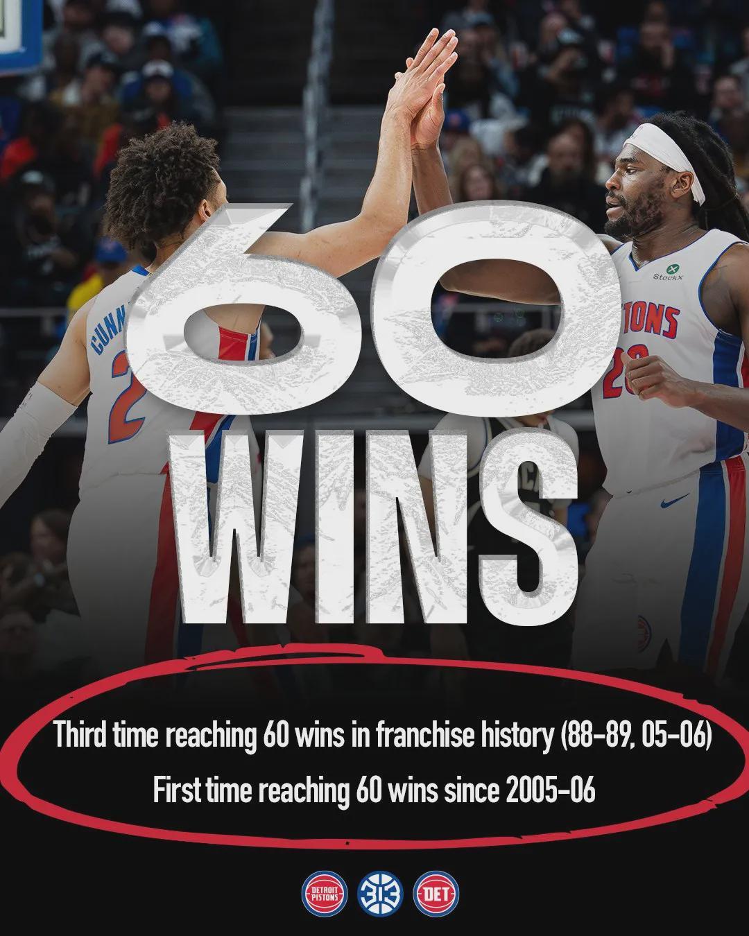 活塞上一次拿到60胜,还要追溯到2005-06赛季,距今整整20年。当时活塞一路打到东决,最后被热火4-2淘汰。活塞队史一共3次斩获60胜:1988-89赛季(63胜19负),2005-06赛季(64胜18负),2025-26赛季(60胜22负)。