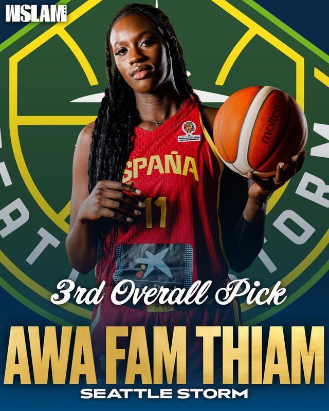 一袭惹眼的红裙(毕竟没啥颜色比这更能代表西班牙了),阿瓦·法姆(Awa Fam)闪亮登场纽约的WNBA选秀大会。这位年轻的中锋被历史悠久的西雅图风暴队以第三顺位“探花签”摘走。这一下可不得了,直接追平了中国球迷的老熟人——保罗·加索尔在2001年被老鹰队选中时创下的西班牙球员最高选秀顺位纪录!对法姆来说,这简直是从12岁起就日思夜想的WNBA梦圆时刻。