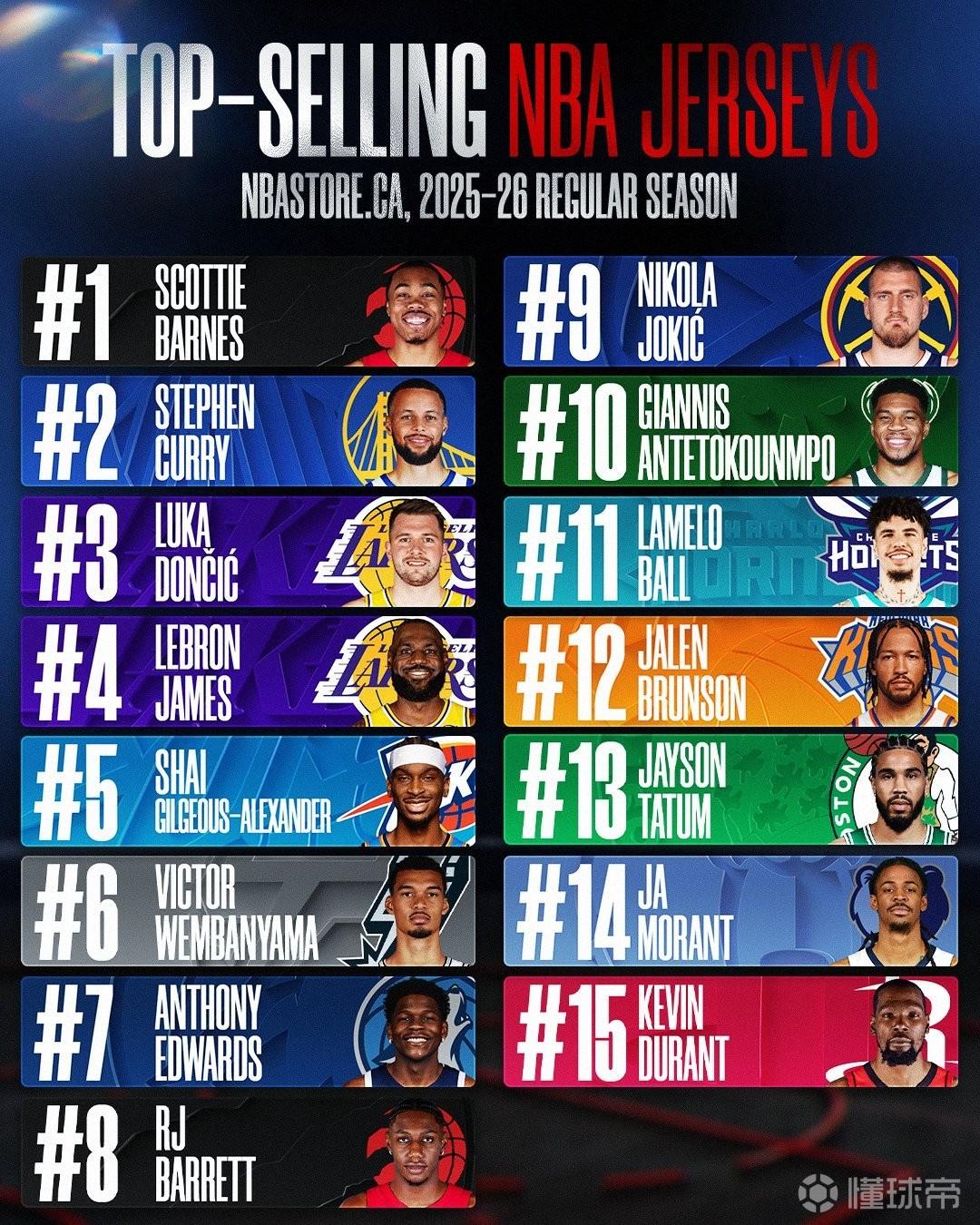 NBA加拿大官方社交媒体账号公布了本赛季NBA球衣在加拿大地区的销量排行榜,多伦多猛龙的球员斯科蒂-巴恩斯销量位列第一,勇士队的斯蒂芬-库里位列第二。