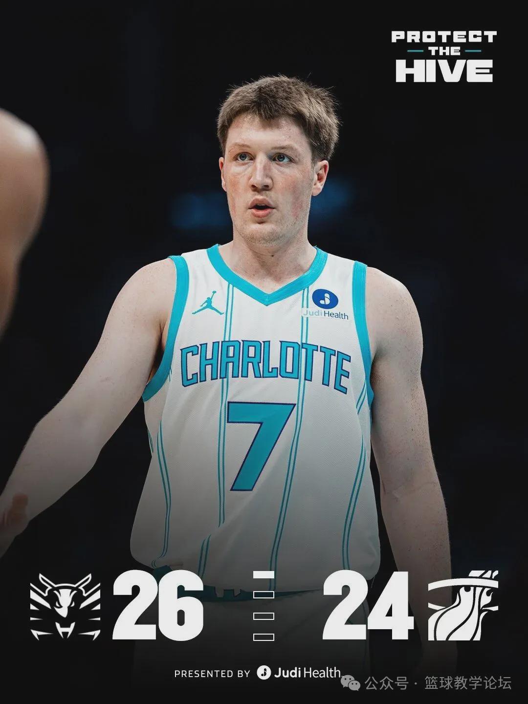 第一节克尼佩尔投篮5中0,其中三分4中0,仅得0分3篮板。第一次打附加赛,这个年轻人有点紧张了。小桥和三球单节合砍19分,帮助黄蜂领先热火。首节战罢,黄蜂26-24热火。阿德巴约跟维金斯都是3中3,两人单节合砍13分。