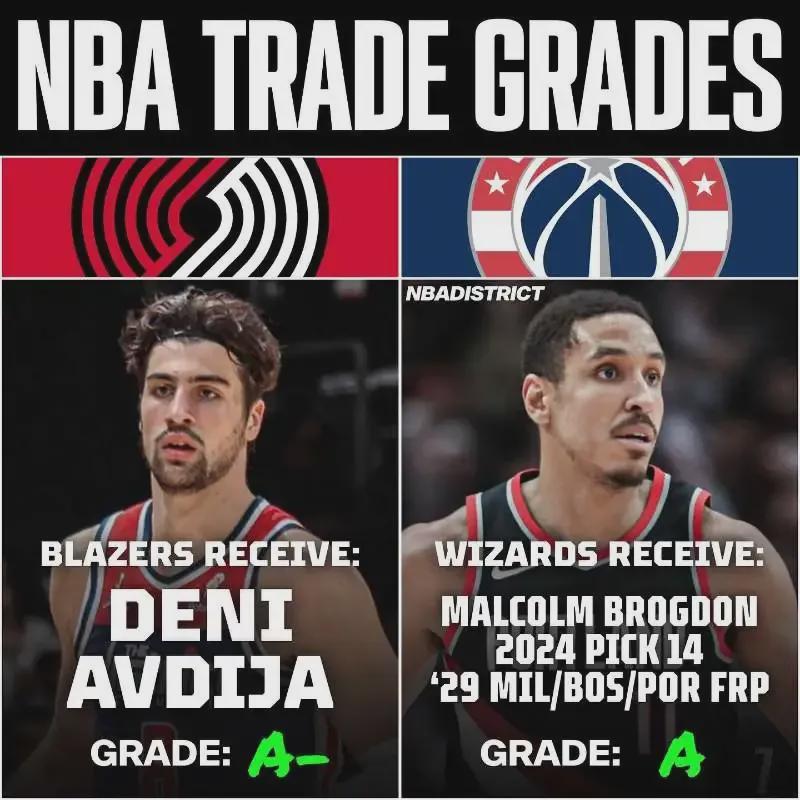 性价比这么高的合同,奇才却主动放弃。2024年夏天,奇才把阿夫迪亚送到开拓者,1换5得到布罗格登、2024年首轮14号签(卡林顿)、2029年首轮签和2个次轮签。如今布罗格登已经退役,卡林顿本赛季场均10.7分3.4板4.6助。