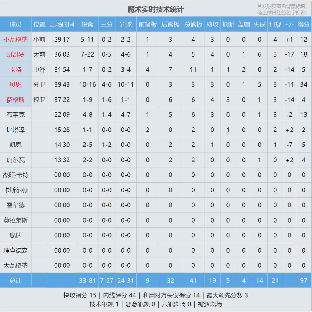 贝恩三分6中4,魔术其他四个首发三分合计15中1!班凯罗的合同5年2.39亿美元,小瓦格纳5年2.24亿美元,萨格斯5年1.51亿美元。这三个人加起来6.14亿美元!如果魔术没进季后赛,今年夏天他们会拆队吗?