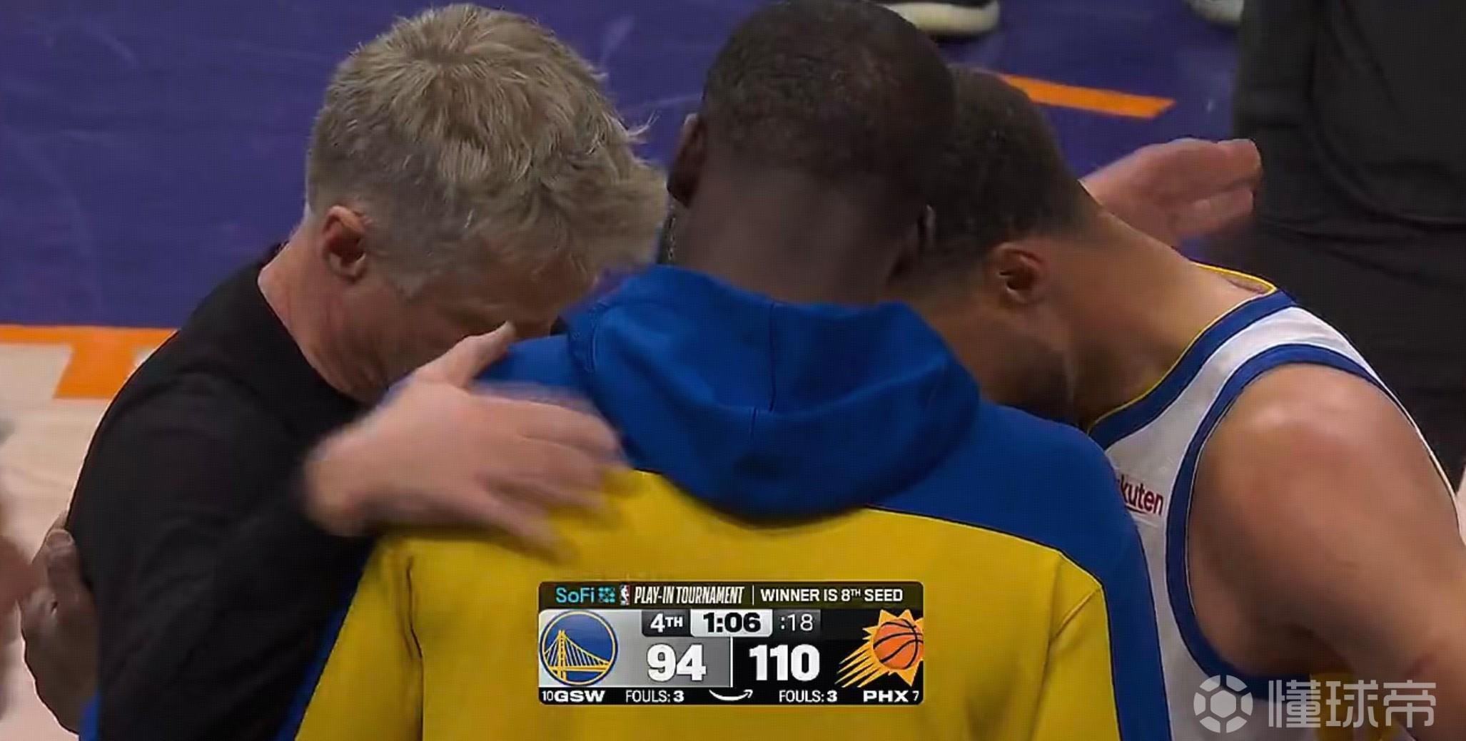 意味深长的拥抱,勇士赢球无望,科尔与库里&追梦相拥致意