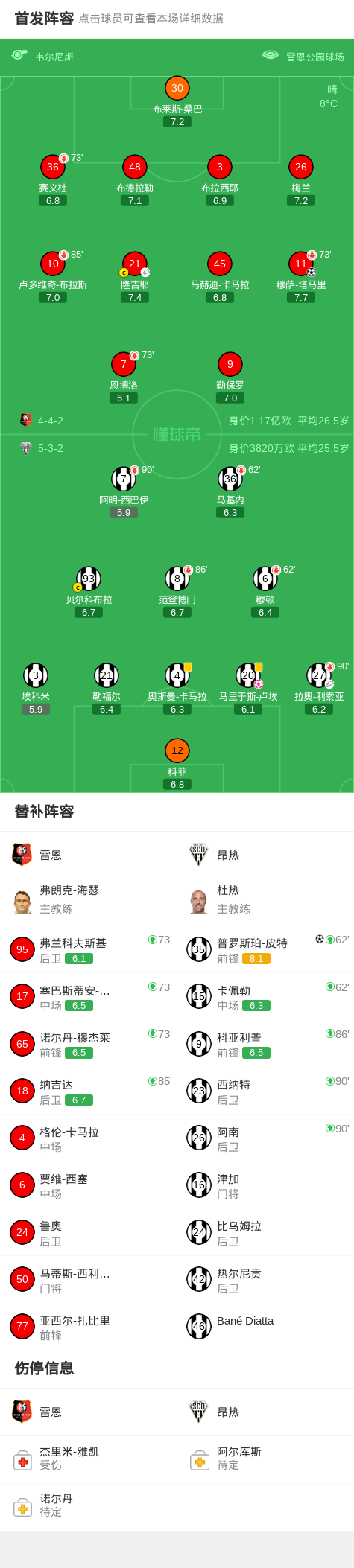 北京时间4月12日法国足球顶级联赛 联赛 第29轮,雷恩主场对阵昂热。雷恩穆萨-塔马里破门。昂热普罗斯珀-皮特破门,马里于斯-卢埃自摆乌龙。最终比分雷恩 2-1 昂热。