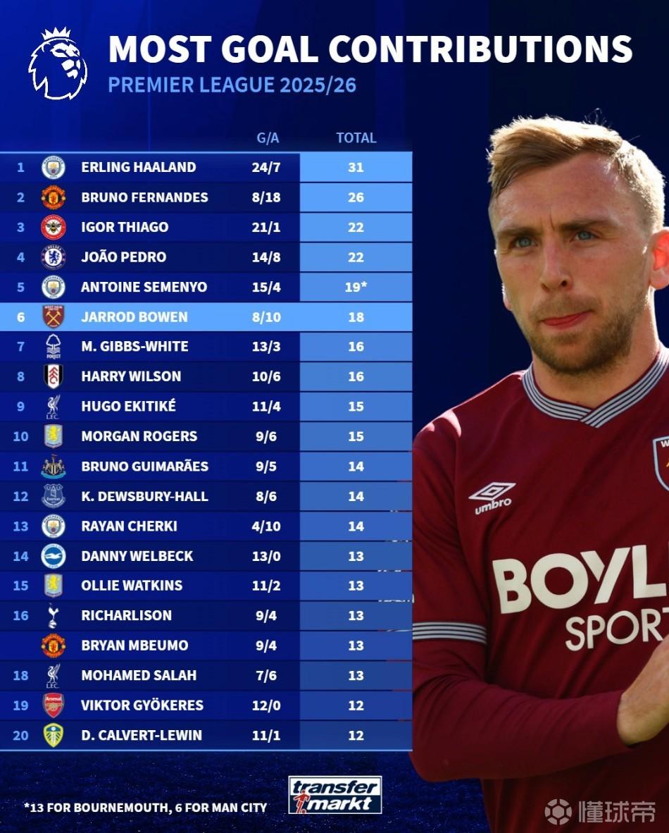 6. 鲍恩(西汉姆联)18球(8球10助攻)