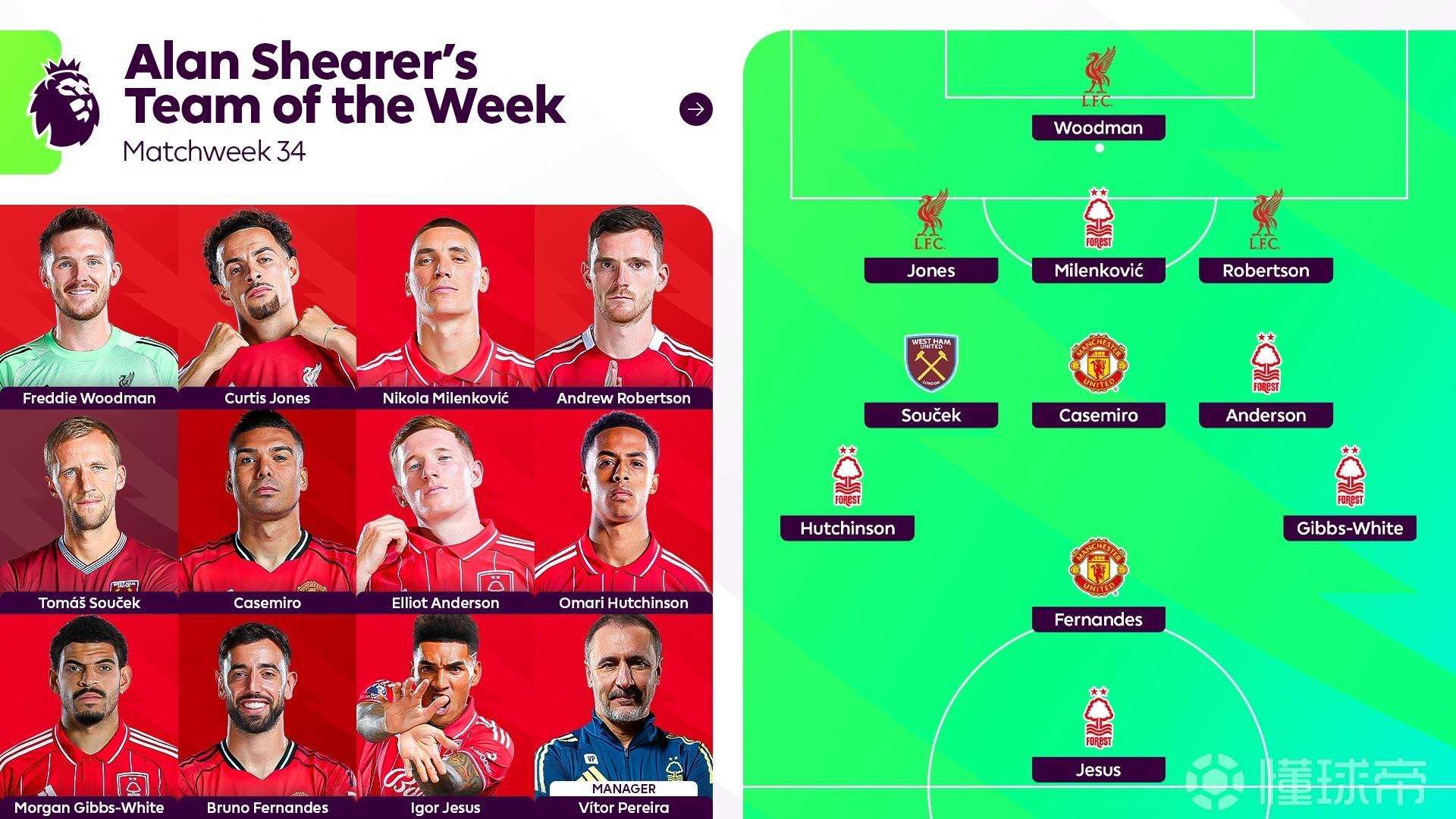 英超官方发布了阿兰-希勒评选的本周最佳阵容,诺丁汉森林五名球员入选,布鲁诺-费尔南德斯、卡塞米罗、罗伯逊、伍德曼等人在列。