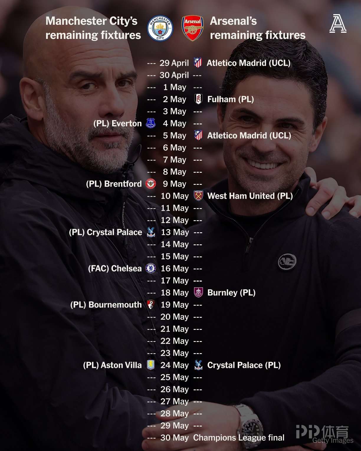 曼城将在5月14日-5月20日遭遇7天3赛的魔鬼赛程,阿森纳将在4月30日-5月6日同样遭遇7天3赛的魔鬼赛程。
