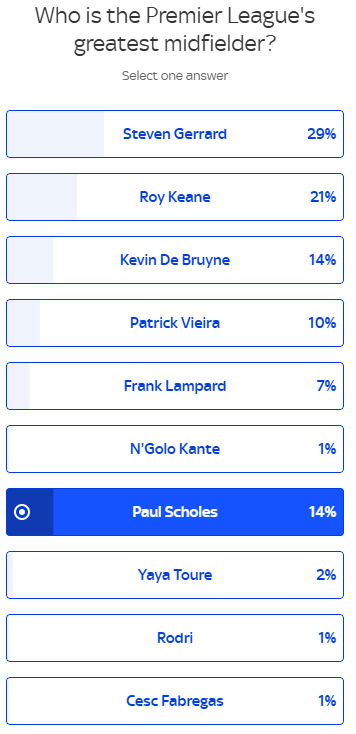 在球迷投票环节,杰拉德同样以29%的得票率排名榜首,其次则是罗伊-基恩(21%)。斯科尔斯、德布劳内同样得到14%的投票。从这一投票结果来看,球迷在斯科尔斯的历史地位上无法认同卡拉格的观点。