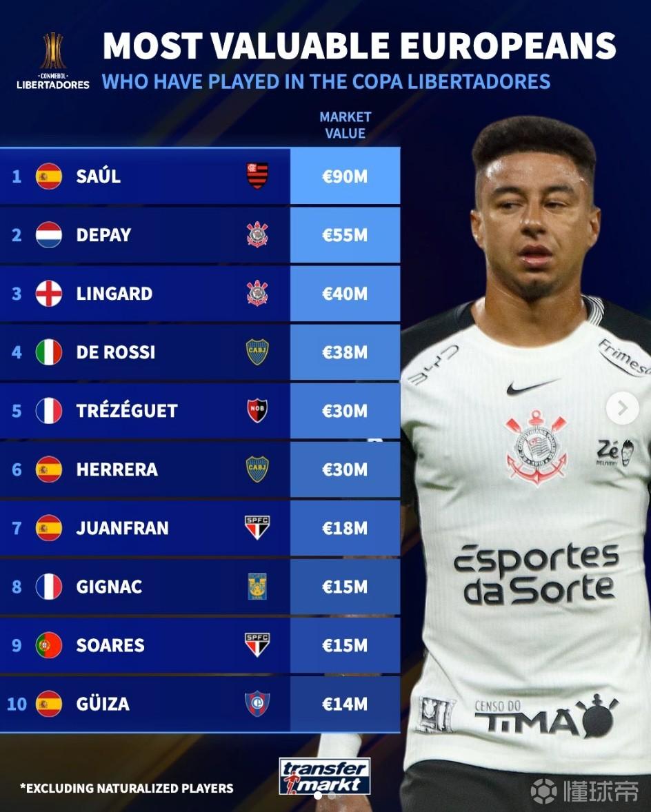 北京时间4月14日,德转列出了参加过南美解放者杯历史身价最高的10名欧洲球员,目前效力于弗拉门戈的萨乌尔9000万欧元排名第一,德佩、林加德、德罗西以及特雷泽盖在列。