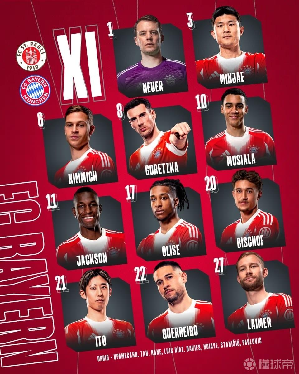 北京时间4月12日0:30,德甲第29轮,拜仁客战圣保利。赛前首发公布。