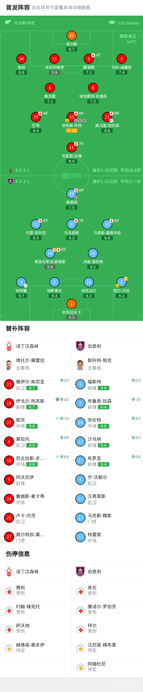 北京时间4月19日21:00,英超第33轮,诺丁汉森林主场对阵伯恩利。上半场,沃德-普劳斯任意球攻门被扑出,穆里略伤退,半场补时阶段,弗莱明推射破门。下半场,吉布斯-怀特15分钟连入3球上演帽子戏法,吉布斯-怀特是森林队史第3位在英超戴帽的球员,伊戈尔-热苏斯补时阶段锦上添花,最终,诺丁汉森林4-1逆转伯恩利,33轮过后高出降级区5分。